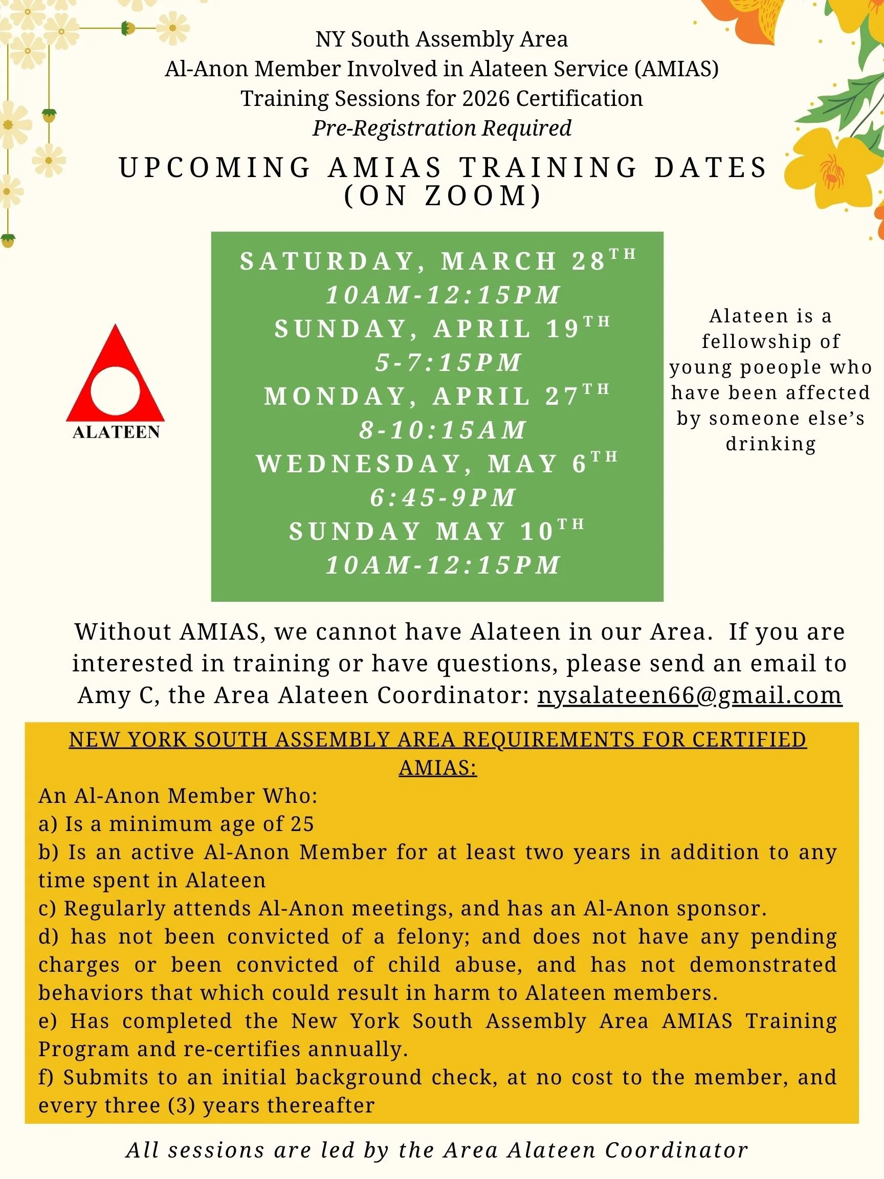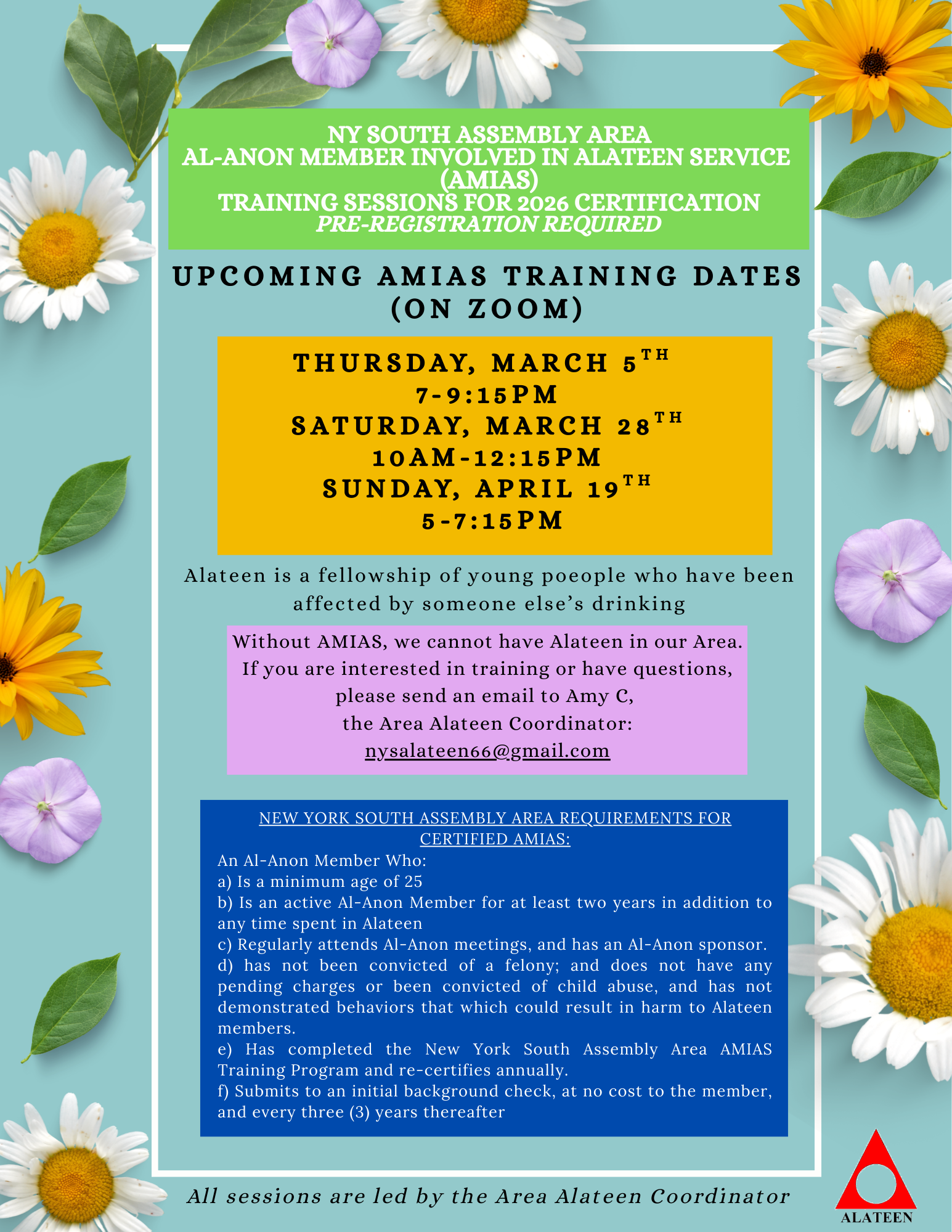 AMIAS stands for Al-Anon Member Involved in Alateen Service. To do the very important work of serving in Alateen you must complete this training as part of the certification process. To register or for any questions, email the Area Alateen Coordinator at nysalateen66@gmail.com. Download a flyer and spread the word!
