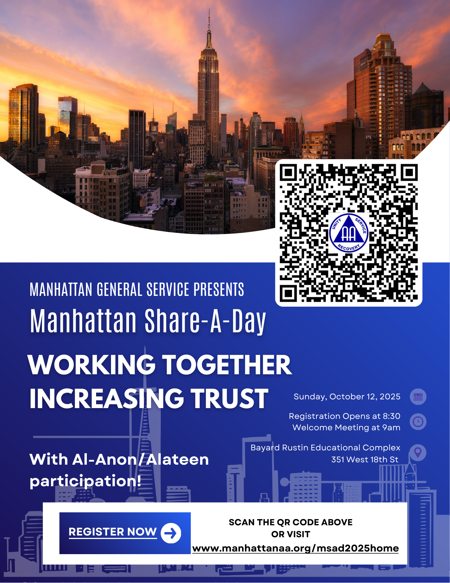 Manhattan Alcoholics Anonymous General Service presents: Working Together - Increasing Trust, with Al-Anon and Alateen participation. Registration opens at 8:30am, welcome meeting at 9am. Click to register Contact: msad@manhattan.aaseny.org Download a flyer