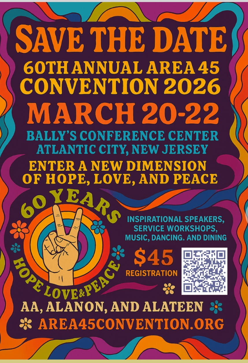 The General Service Area 45 Southern New Jersey 60TH ANNUAL CONVENTION, "Hope, Love & Peace," takes place at Bally's Conference Center in Atlantic City, New Jersey. Guest speakers, workshops, marathon meetings, archives, Serenity Room, yoga, and much more! Questions? Please contact maryteresas@yahoo.com Download a flyer