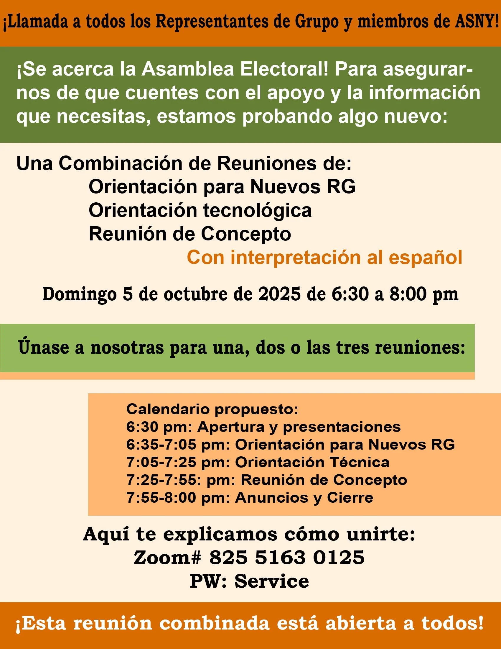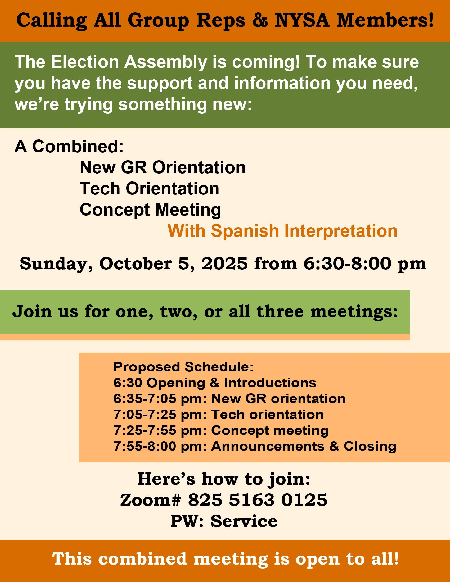 Calling all group reps and NYSA members! Get the support and information you need for the Election Assembly by joining this online combined meeting. The session includes a GR Orientation, Tech Orientation, and Concept Meeting, with Spanish Interpretation.