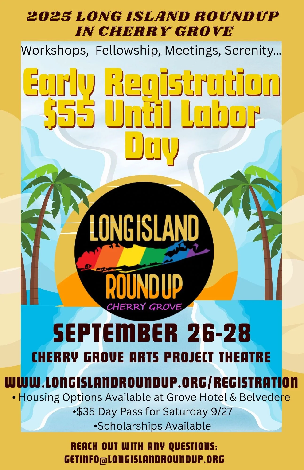 Founded in 1988, LIRU proudly celebrates another year of recovery, unity, and service in AA & AL-ANON for the LGBTQ community and our allies. As Long Island’s only LGBTQ recovery event, we offer a one-of-a-kind opportunity to connect, reflect, and grow in a serene and supportive setting on Fire Island! Visit https://www.longislandroundup.org/ for programming and email getinfo@longislandroundup.org for more information. Download a flyer