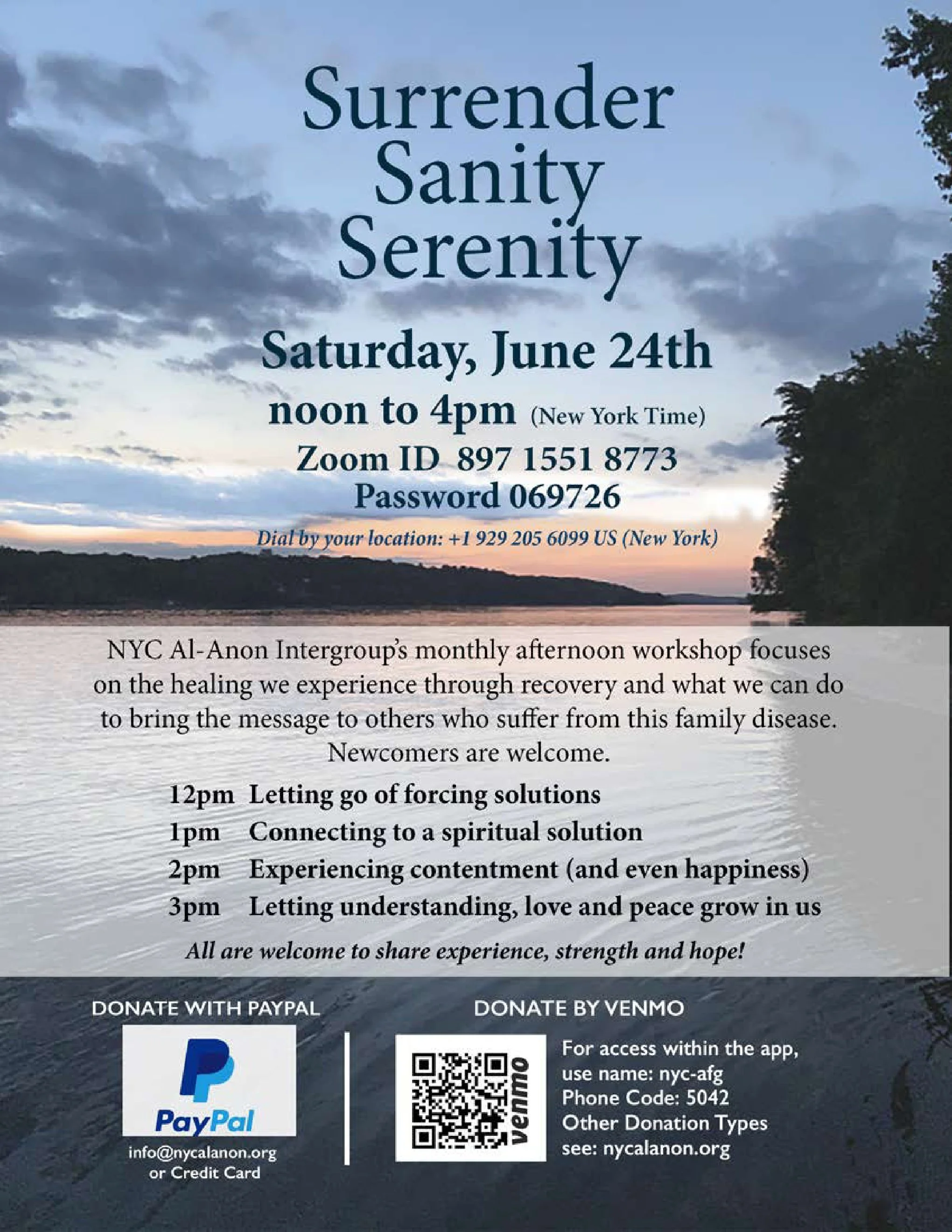 Greater NY Al-Anon Intergroup’s monthly afternoon workshop focusses on the healing we experience through recovery and what we can do to bring the message to others who suffer from this family disease. Newcomers are welcome.