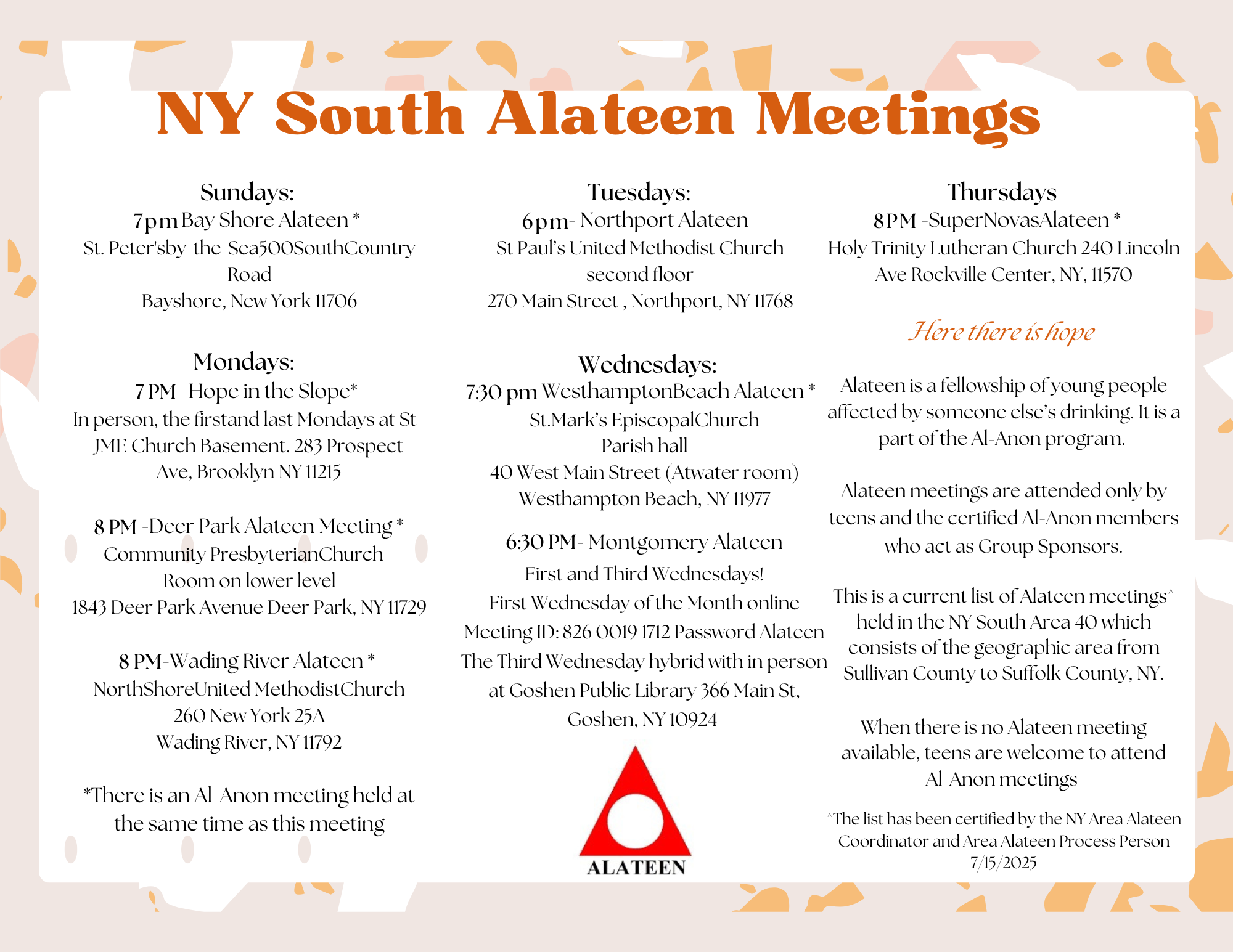 Please note: When an Alateen meeting is not available, teens are always welcome to attend an Al-Anon meeting.
